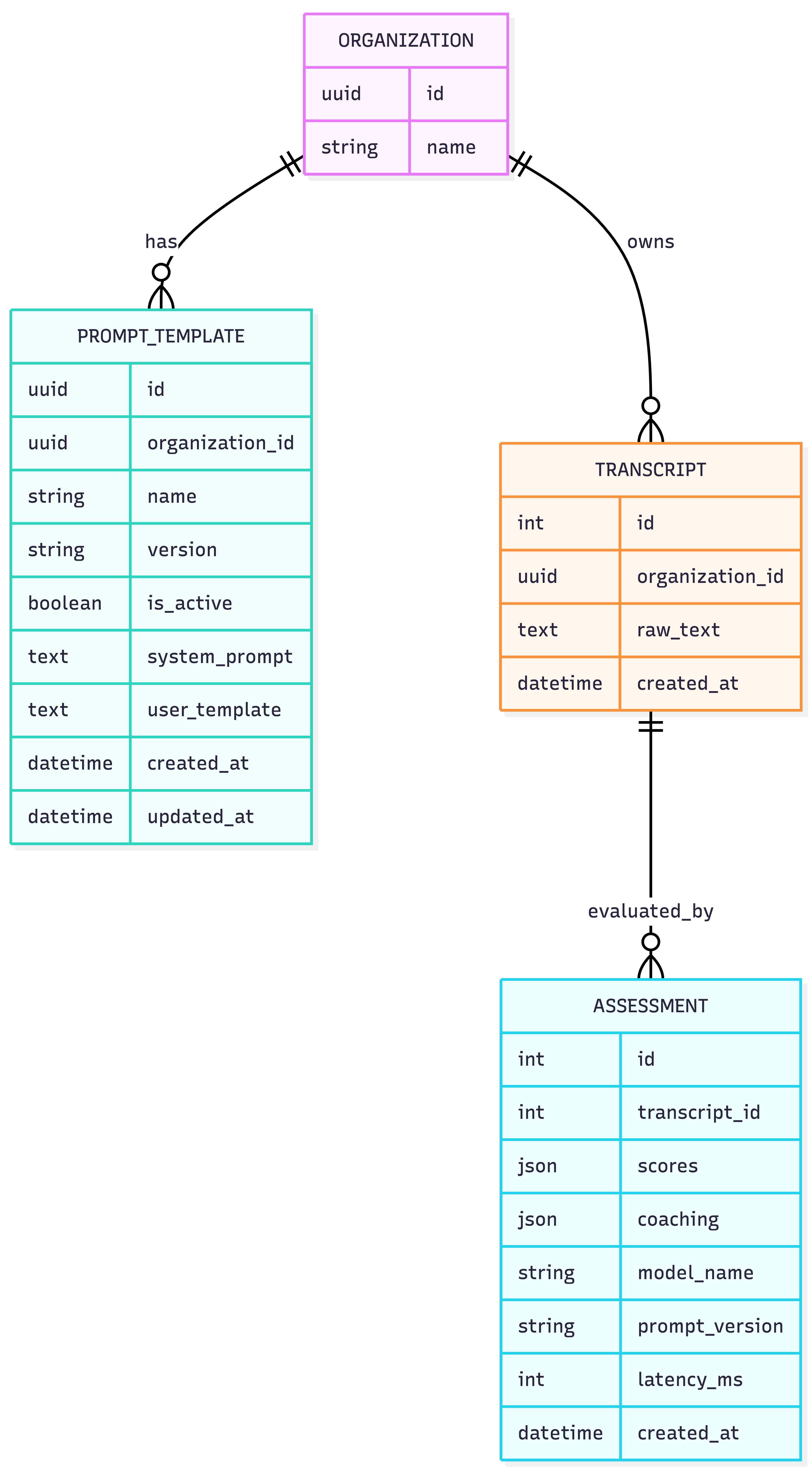 Prompt templates as evaluation contracts: versioned rubrics stored in Postgres, with an “active template per org” and an assessment audit trail that records prompt version.